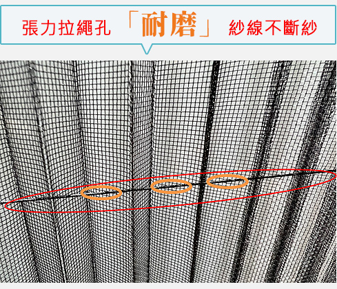 4.紗網紗線耐疲勞、磨擦,完全不會因拉繩拉動時所產生的對磨造成折網拉繩孔徑有不斷擴大之情形,易造成蚊蟲侵入 。